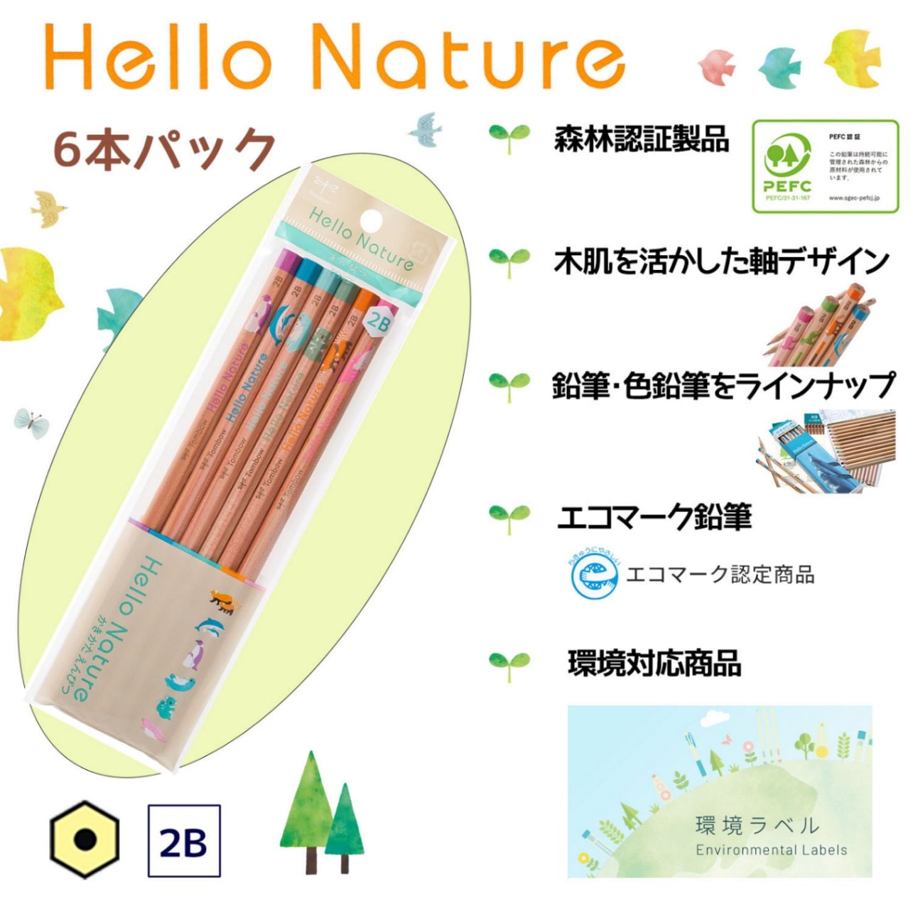【6本パック】鉛筆 名入れ鉛筆 トンボ鉛筆 ハローネイチャー かきかたえんぴつ ギフト用 硬度2B ACF-664F
